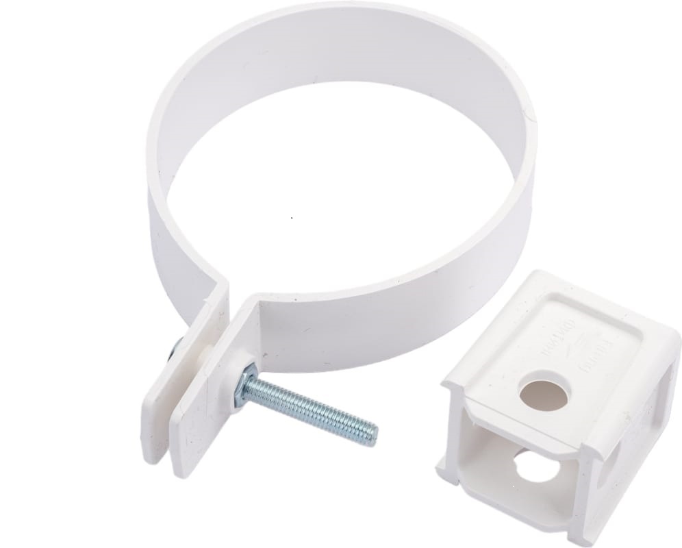 Хомут, окрашенный в цвет, необходим для крепления к фасаду здания труб, колен, соединительных муфт и наконечников такого же цвета.